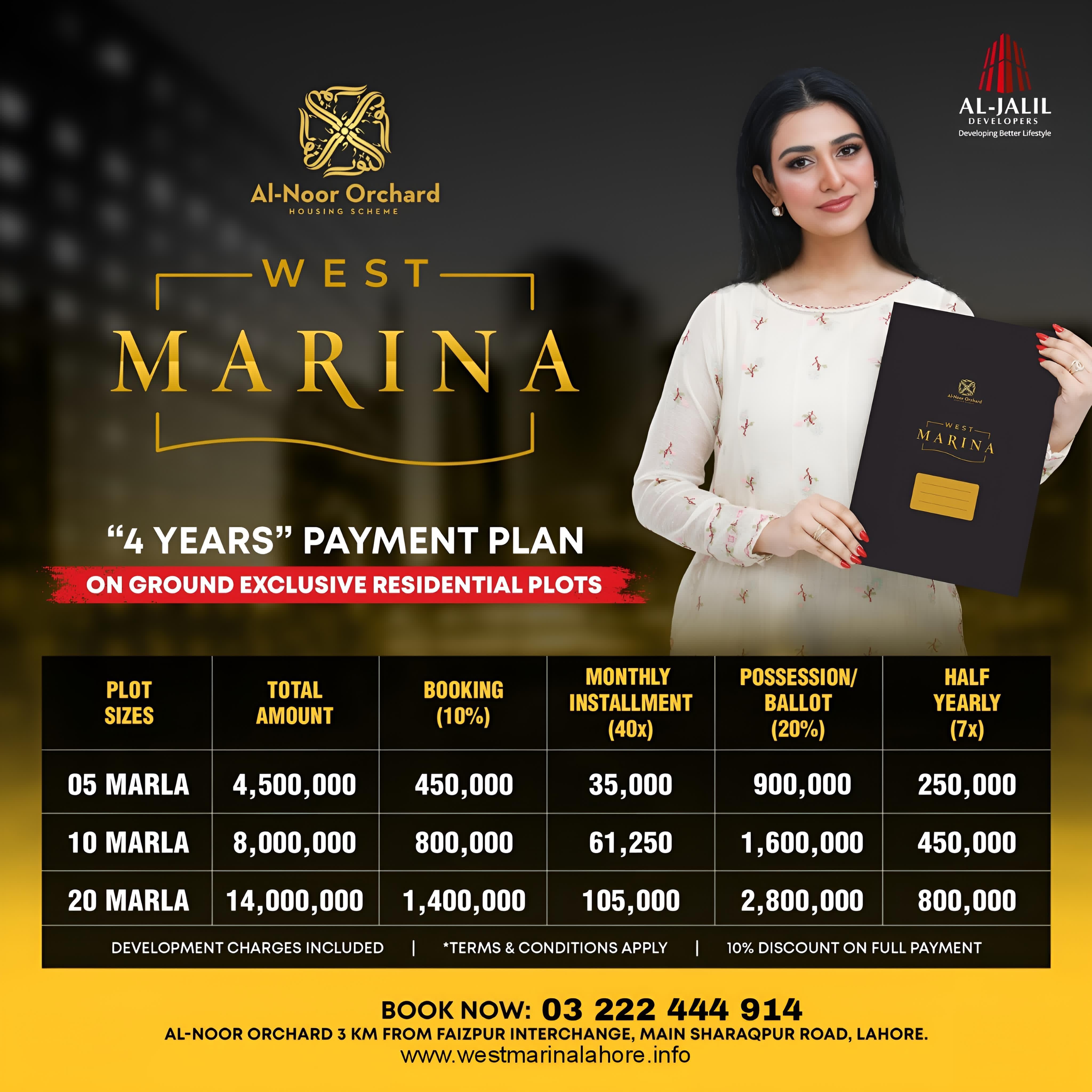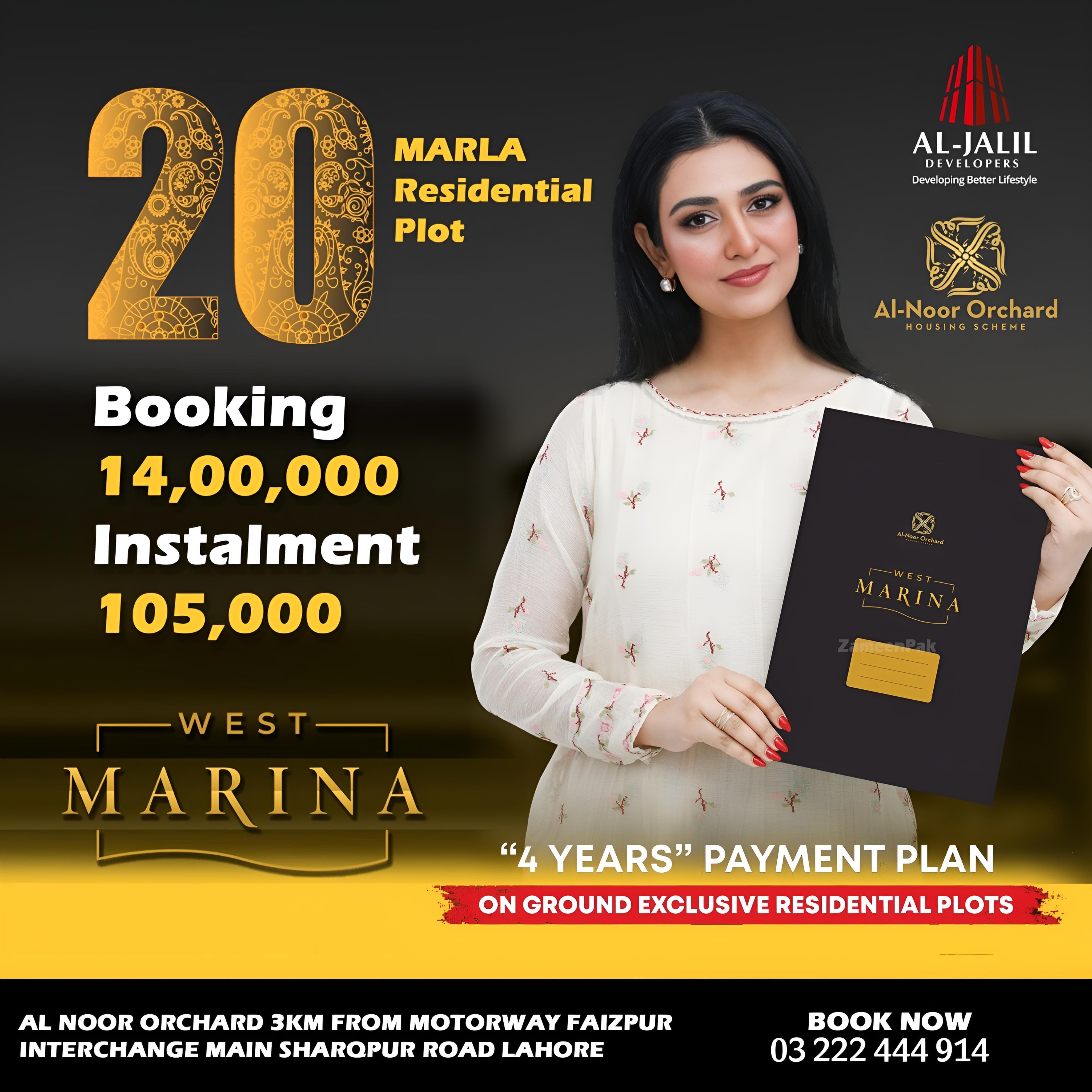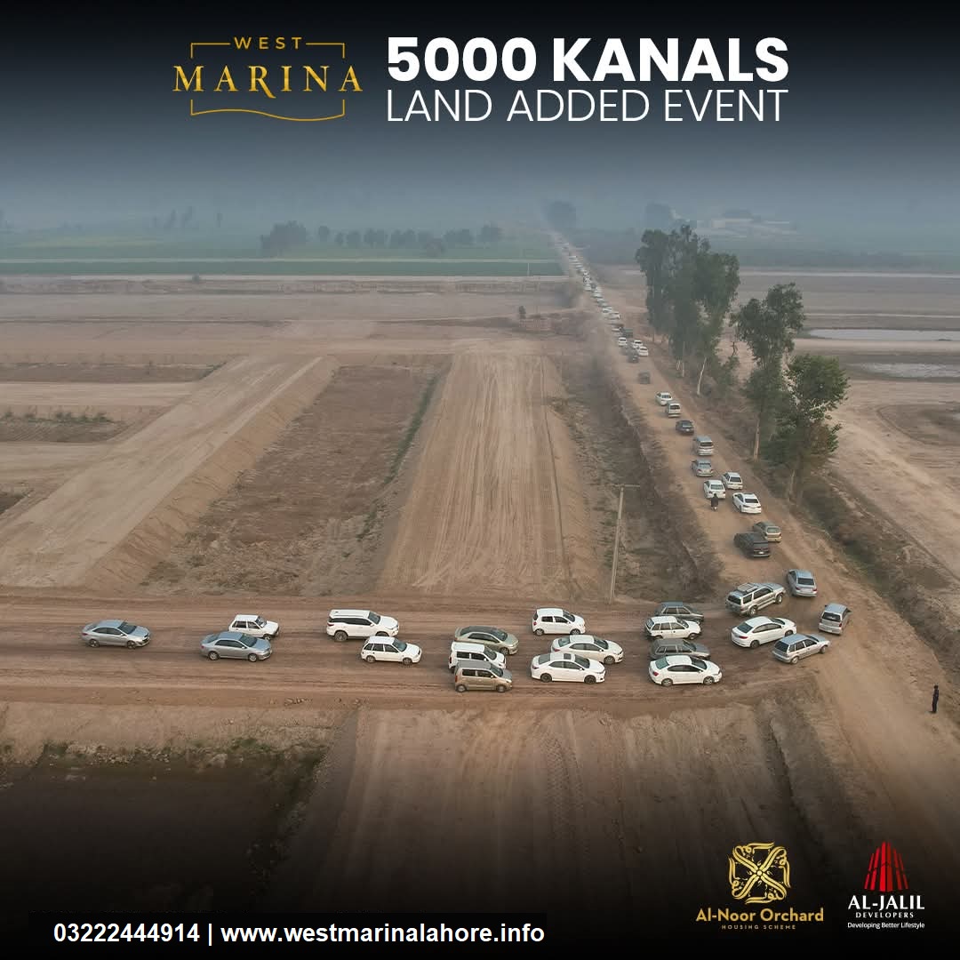 West Marina, part of Al-Jalil Developers' Al-Noor Orchard project in Lahore, has launched a new deal offering exclusive residential plots for investment and development. This new deal features on-ground plots with ready possession, making it an ideal opportunity for homeowners and investors. The development boasts modern infrastructure, world-class amenities, and a focus on sustainability. Residents will enjoy access to green spaces, schools, hospitals, shopping centers, and recreational areas. With enhanced connectivity and prime location in Lahore West, West Marina promises long-term value, offering a promising investment in a growing, thriving community.
